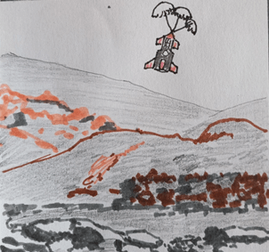 Daddy steered the rocket towards it, then they went into orbit, searching for the place where Polly might live. James thought he could see a little town on the edge of a lake. So, they fixed three umbrellas onto the top of the rocket and aimed it down…down and gently down towards the surface.