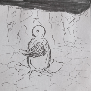 And then – out of the snow came what looked like a tiny white finger. Slowly, ever so slowly, rose up a grey ball with a spot in the middle. The spot stopped still and the finger pointed straight at Mummy, Daddy and James. The ball and the finger reminded James of a penguin except with only one eye and one flipper arm.