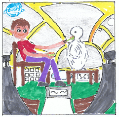 It was rather crowded with six of them in the rocket. Firstly, Mummy opened a large tin of sardines and mashed them up. She made sandwiches for herself, James and Daddy, then they fed the fish into the Fossicles’ mouths with spoons. James fed Polly, who loved it! He asked Polly how long it had been since she’d eaten fish. Polly and her mummy clicked and whistled for a while. They weren’t sure, but they thought they’d been asleep for a year.