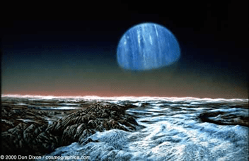 So, they lit some more fireworks and off they headed – towards Triton. Three days later, they approached the moon. The blue-coloured Neptune looked very beautiful as it shone out behind Triton’s rocky surface.