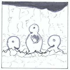 They were right. The first creature they’d seen was Polly, and like James, she was with her mummy and daddy. They had spent all their lives as part of a large family called the Fossicles who lived in a huge underwater lake, always wondering what lay on the outside. There were plenty of tiny fish in the lake. The Fossicles fed themselves by swimming around all day with their mouths open.