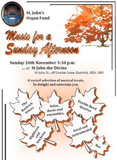 sung to the tune of Finlandia. This was the finale to our magnificent Autumn concert at a packed-out St John’s church, arranged by Pam, our music director, and Graham, one of our organists. Under Pam’s gentle cajoling, our collection of amateur singers (such as me) did justice to Graham’s score. Jane accompanied splendidly on the piano, with the woodwind and a violin providing the introduction before adding panache to the final crescendo.