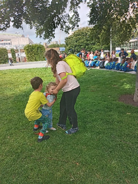 We’d had plans for another cultural experience, but decided instead to visit the children’s play area at Jubilee Gardens on the South Bank. Olena and Sam scrambled about amongst the large circular logged climbing frame, each making new friends of their own age. Meanwhile we three adults treated ourselves to a sit down. Just as we felt things were drawing to a natural end, I felt a gentle touch on my shoulder and became aware of a child’s arm rubbing against my back. And who should be there but Grace (2), whom Martin had brought to search for Grandpa Jane – or was it Grandma John? It wasn’t long before Olena was guiding Grace around the edge of the playground, and finally all three children ended up romping on the grass.