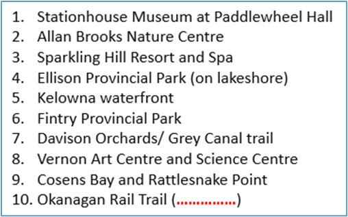 10. Okanagan Rail Trail. I hate learning that a railway has closed. However the demise of the Vernon to Kelowna route has opened up a wonderful trail for cyclists. We hired bikes from a shop at the trail head in Coldstream at the north end of Kalamanka Lake and rode for an hour along the shore before turning back, stopping for pictures at several pretty viewpoints along the way.
