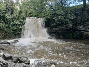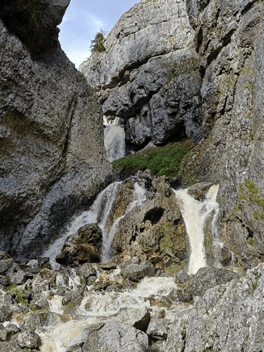 The internet says it’s for experienced climbers (so how come we did it?). It certainly was not suitable for a wet week when Gordale Beck was in spate, cascading across the full width of the falls. And even more certainly, not for a 74-year-old codger limping with the aid of a walking stick ‘cos of a gammy hip. But this didn’t stop us admiring the falls, appreciating the raw energy of the torrent above.