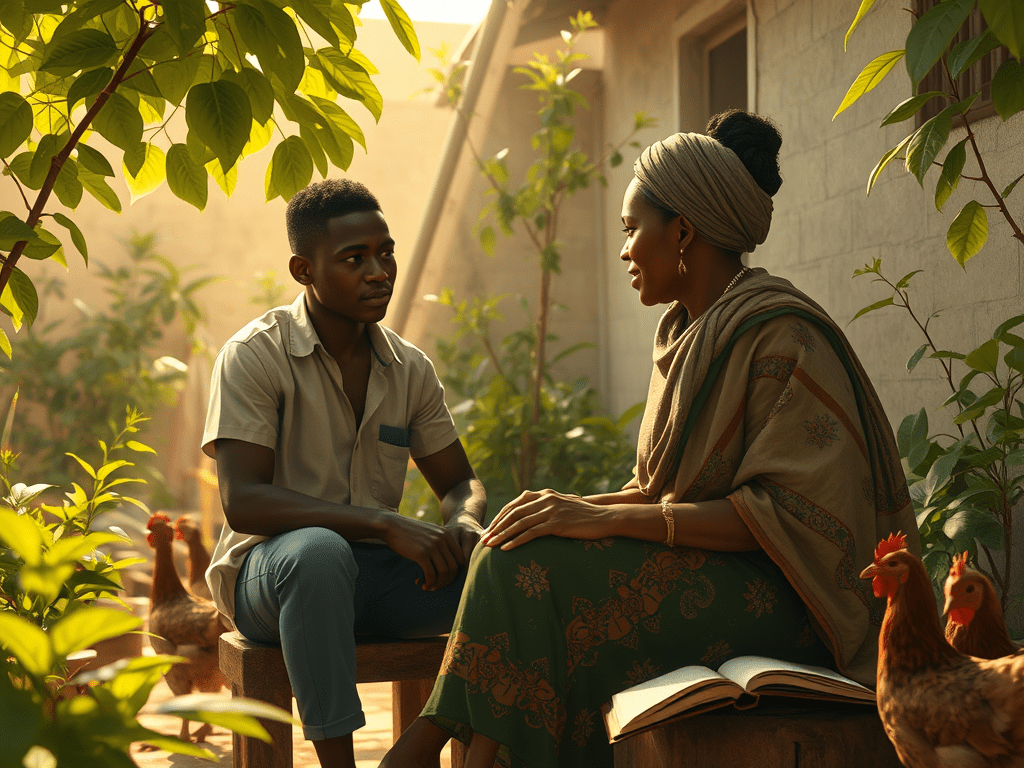 Olu, a recent graduate in Agriculture aged 22, is looking for work. He’s talking to his aunt Felicity, recently widowed with 3 young children. Olu is regarded as a man of strong faith. He always has a lot to say in the church meetings and is good at quoting scripture. Felicity, on the other hand, doesn’t know much theology, whatever this means. Apart from a few rather helpful bible verses…