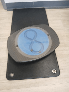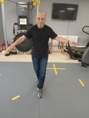 Jan did, bravely, bring a wobble board back into service, this time a figure-of-8 version. But now it’s placed on a soft mat, and you’ve got to hold a rail whilst you balance on it.